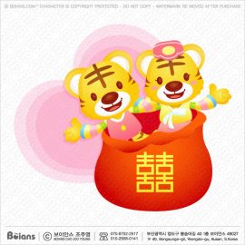 보이안스 벡터 복주머니 안에 있는 한국 커플 호랑이 캐릭터. 호랑이띠 캐릭터 일러스트. SKU: KOREA004453
