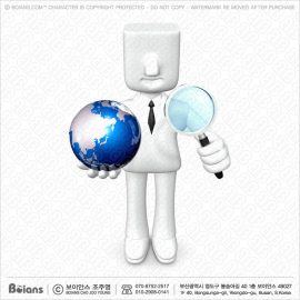Boians 3D Square Human Mascot holding a globe with magnifier.