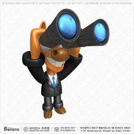 보이안스 3D 세일즈맨 캐릭터는 쌍안경을 보고 있다.