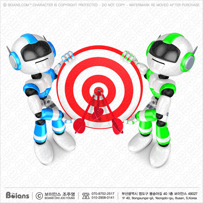 보이안스 3D 다트판을 잡고 있는 블루와 그린 로보트 캐릭터.