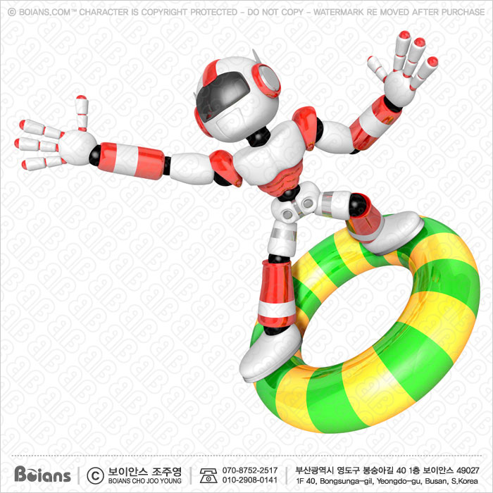 Boians 3D Red Robot character surfing on lifebuoy. SKU: B3DC000783